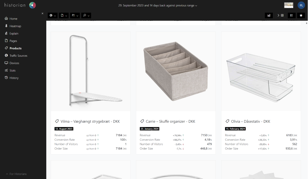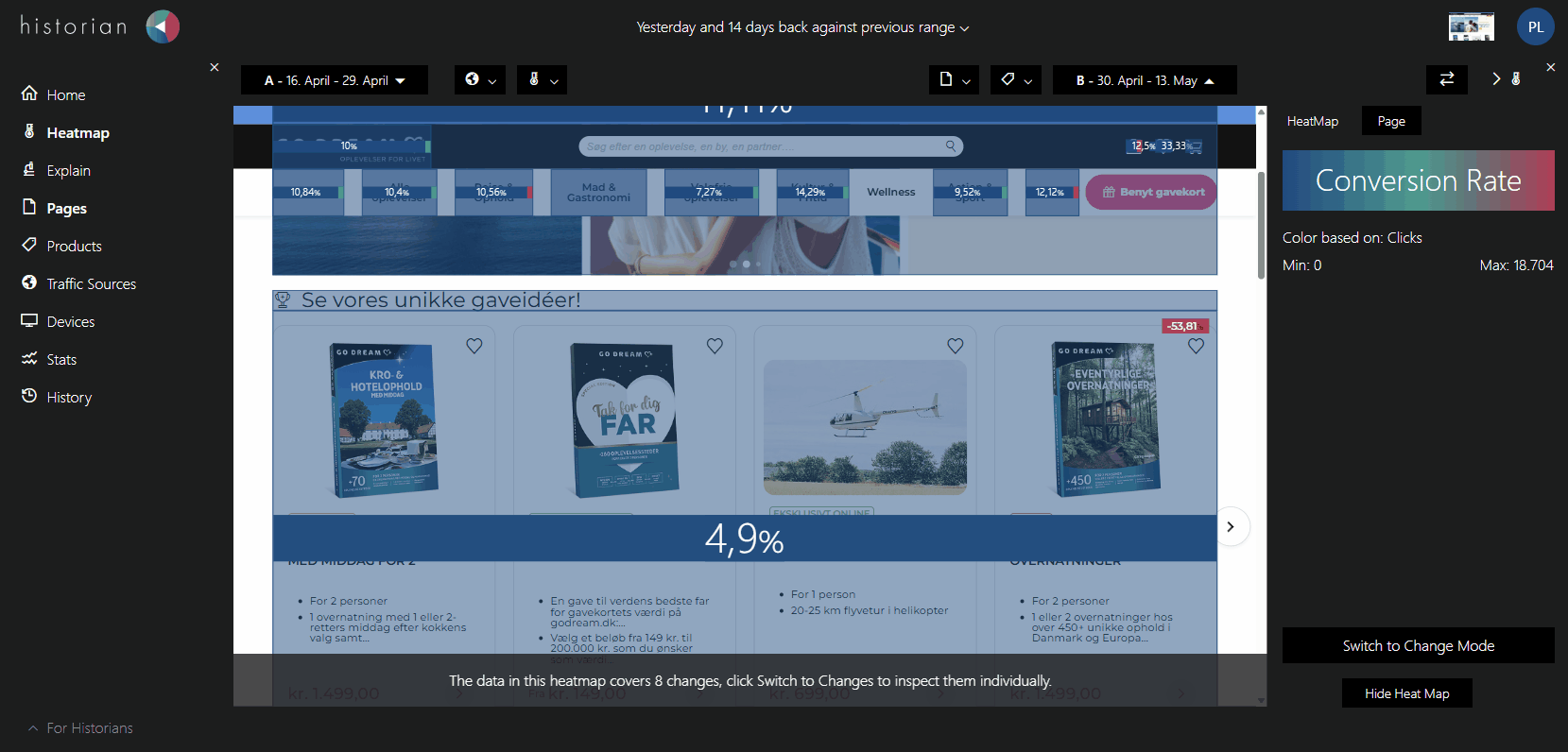 Historian’s heatmaps tie interactions to conversion rates, revenue per click, and even products purchased—all permanently stored. Whether you’re revisiting last Christmas or yesterday, our heatmaps show the exact version of your site for reliable, data-backed decisions.